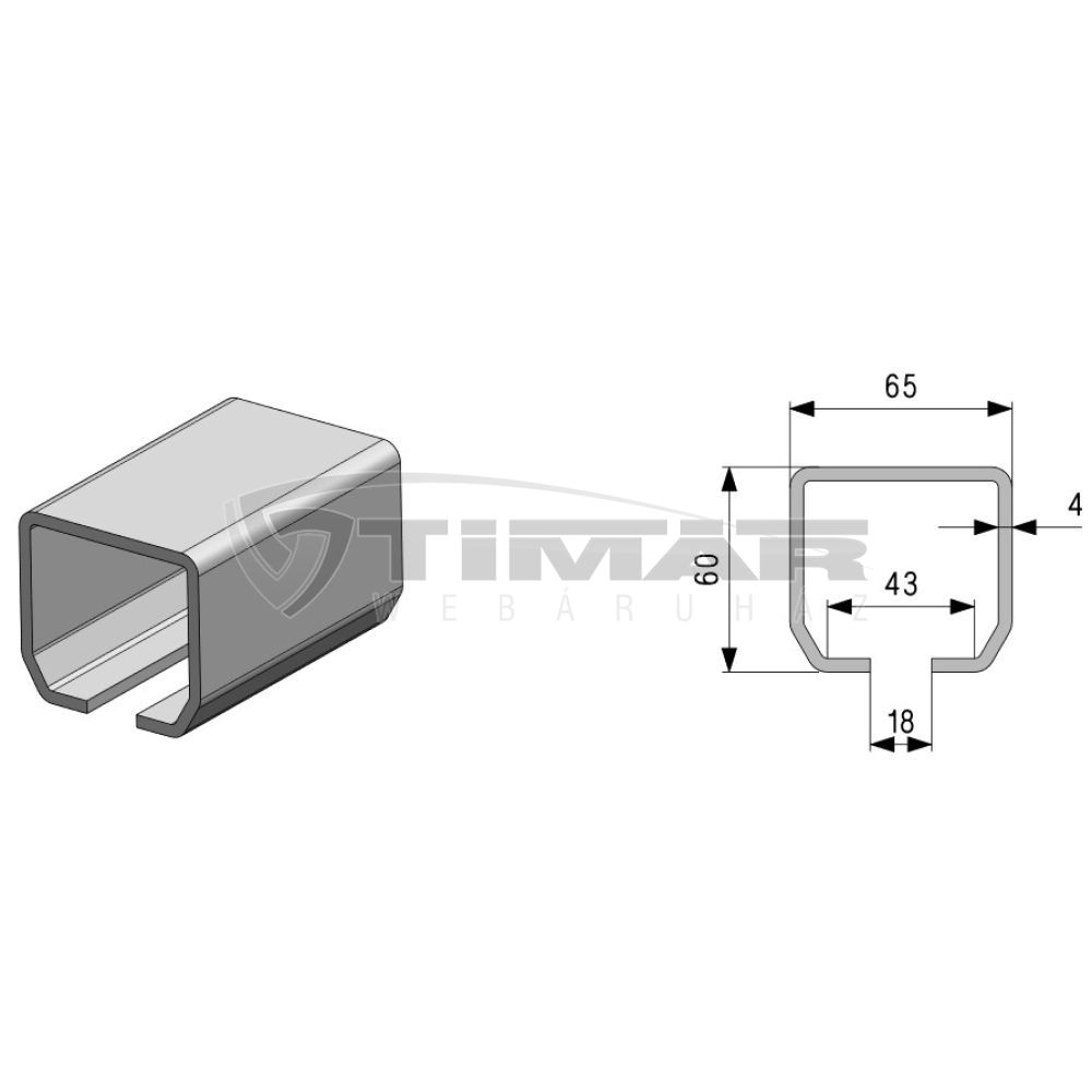 C65_G 6M profil, mérete: 60x65x4mm, anyaga: tűzi horganyzott S350GD . Az Európai Uniós szabványok szerint: EN 10346-09, EN 10162-03, DIN 620, DIN 625. A tűréshatárok az EN 10143-06 szabvány szerintiek. Ez a profil egyaránt alkalmas úszó és függesztett kapuk gyártására is. A szerelési előírásokat és méretezéseket betartva alkalmas a BS EN 13241-1 szabványnak megfelelő késztermékek (kapuk, ajtók) gyártására